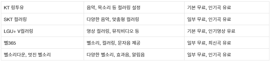- 통신사 컬러링 서비스와 벨소리 앱 모두 일부 무료 콘텐츠가 있지만, 최신곡·인기곡·특정 아티스트 곡 등은 대부분 유료로 제공됩니다.