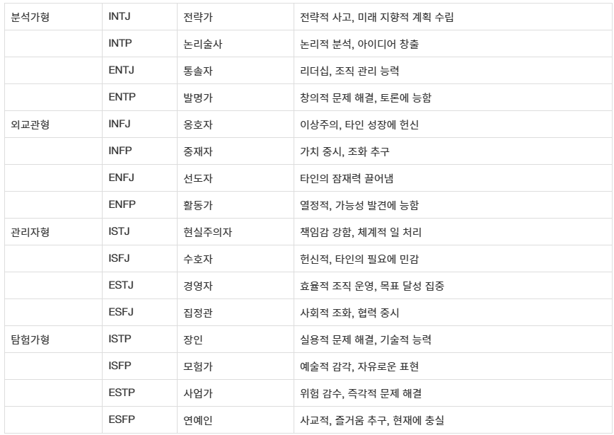 - 각 유형별로 잘 맞는 직무와 조직 환경이 다르므로, 진로 탐색에 참고할 수 있습니다